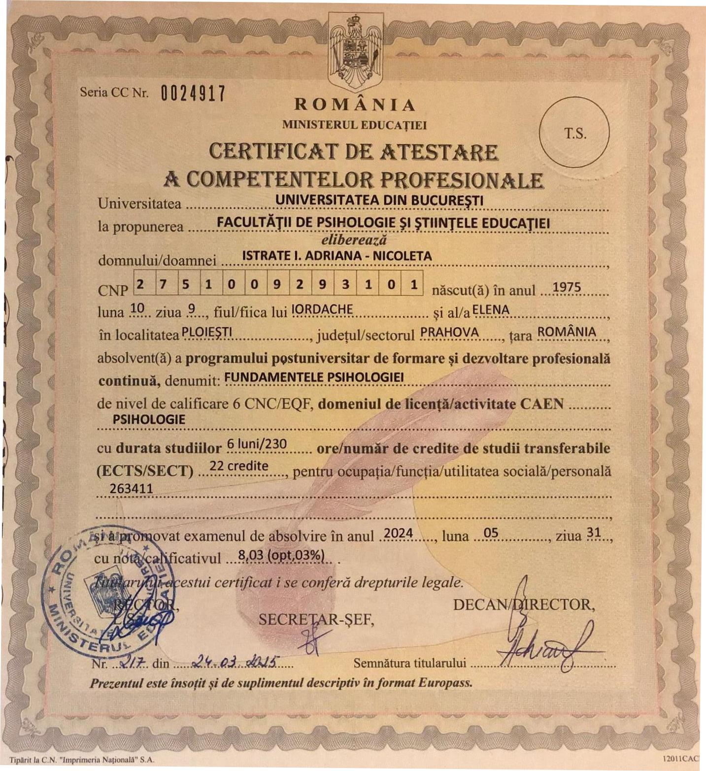 Am început să studiez despre blocaje, credințe limitative, traume și așa am descoperit analiza tranzacțională, o abordare psihoterapeutică care m-a ajutat să înțeleg mai profund dinamica comportamentelor și să dezvolt un set de instrumente pentru transformare. Am învățat să recunosc și să eliberez credințele limitative, să navighez cu încredere prin haosul emoțiilor și să-mi construiesc o relație mai sănătoasă cu mine însămi.